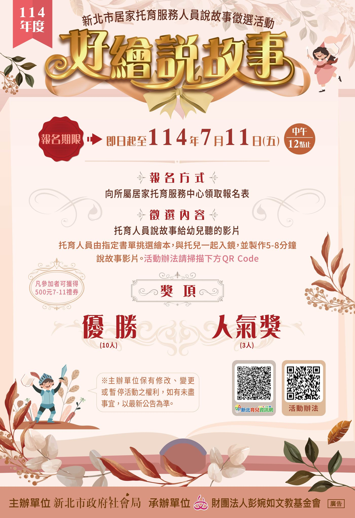 徵件內容與注意事項:(一) 托育人員從指定書單(附件一)內挑選 1 本繪本(書本請自備)說故事給 6 歲以下的幼兒聽,並錄製成影像。